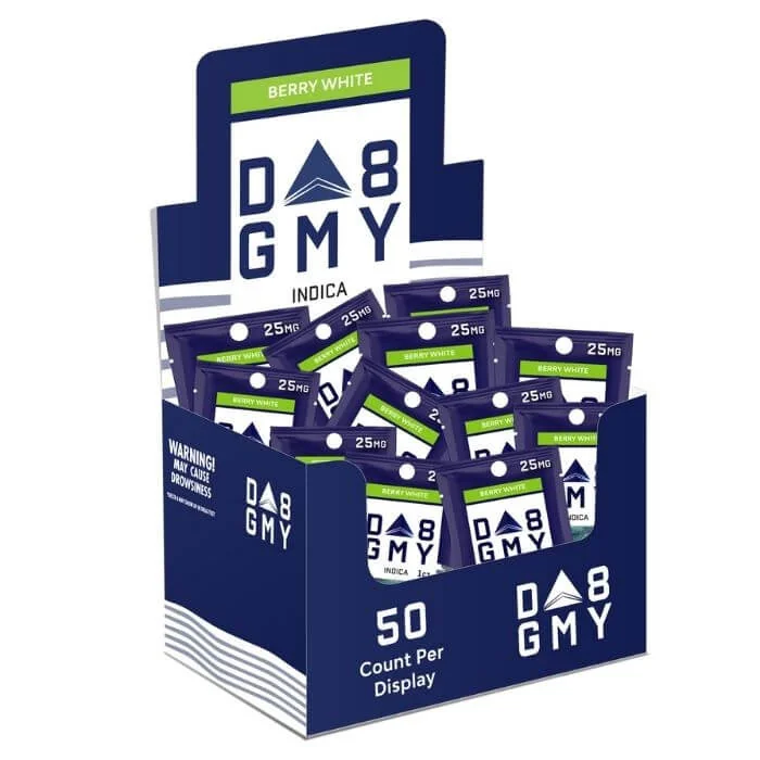 Our 25MG Delta-8 gummies are conveniently packaged in a 30 Count jar, for the avid lover of our gummies that dose regularly. Same great flavors that deliver a potent irreplaceable uplifting and euphoric feeling with a calming body sensation. Available Flavors: Berry White - Indica. Blue Watermelon - Sativa. Cherry Garcia - Sativa Green Apple OG - Sativa. Maui Mango - Sativa. Orange Crush - Sativa. Pineapple Diesel - Sativa. Raspberry Kush - Indica. Strawberry Fields - Indica. Contains: 50 Bags Gummies per Display.