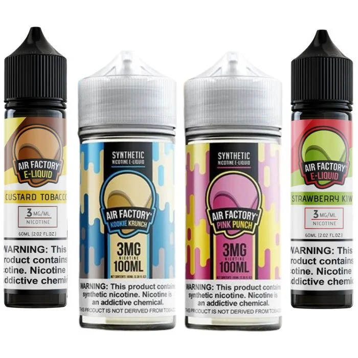 Air Factory E Liquid comes in 60ml and 100ml bottles with nicotine options of 3mg and 6mg, crafted to satisfy vapers who prioritize rich flavor and dense vapor clouds. This e-liquid offers a wide range of vibrant flavors, ensuring there’s something for every palate. Its formula promotes thick vapor production without sacrificing the smoothness or boldness of the taste. Designed for sub-ohm devices, it balances premium ingredients and high performance to keep customers coming back for more. Air Factory E Liquid Features: Bottle Sizes: Available in 60ml and 100ml options. Nicotine Strengths: Choose between 3mg and 6mg. Flavor Variety: Wide range of flavors to suit every preference. High Vapor Production: Formulated for thick, satisfying clouds. Exceptional Taste: Crafted for bold, clean flavor delivery. Air Factory E Liquid Flavors: Aloha Strawberry: Sweet strawberries with a tropical twist. Arctic Berry Pom: A cool blend of berries with pomegranate and icy menthol. Berry Burst (Berry Rush): A medley of mixed berries for a fruity explosion. Blue Razz: Tart blue raspberry with a sweet finish. Blue Razz Ice: The classic blue raspberry flavor with a refreshing icy kick. Blue Razzberry Lemonade: A tangy mix of blue raspberry and lemonade. Custard Tobacco: Smooth tobacco with a creamy custard undertone. Dutch Apple: Crisp apple flavor with a hint of cinnamon. Grape Apple: Juicy grape meets fresh apple in this delightful combo. Hawaiian Pineapple: Sweet and tangy pineapple straight from the tropics. Menthol: Pure, cool, and refreshing menthol. Mint: A classic, refreshing mint flavor. Mix Berry: A flavorful combination of various berries. Mystery: A surprise blend of fruits that keeps you guessing. Pink Berry: Sweet berries with a hint of tartness. Pink Punch: A vibrant, sweet pink lemonade. Pink Punch Ice: Pink lemonade with a frosty menthol finish. Razzberry Blast: A bold and tangy raspberry delight. Red Apple: Crisp and sweet red apple flavor. Savannah