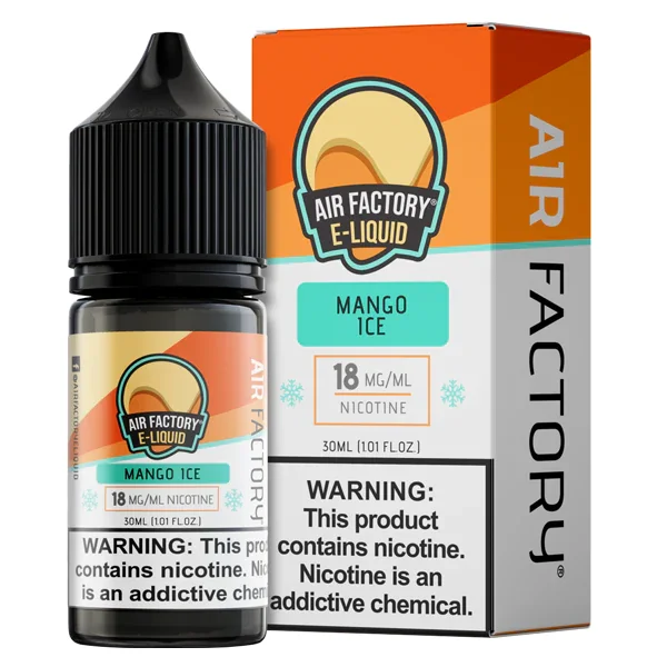 NICOTINE SALTS | Individual Bottle Flavor : Mango Ice by Air Factory is a magnificent blend of mangoes, menthol, and powerful nicotine salts that will delight the senses. E-liquid contents : 30mL Nicotine Strengths : 18mg and 36mg Blended for use with Pod Systems Browse more E-Liquid Brands Here