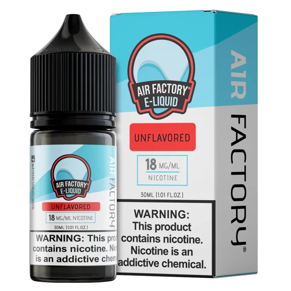 NICOTINE SALTS | Individual Bottle Flavor : Unflavored by Air Factory uses no added flavoring and is simply the finest vegetable glycerin, propylene glycol and nicotine. A great option for vape shops in areas that have local flavor bans. E-liquid contents : 30mL Nicotine Strengths : 18mg and 36mg Blended for use with Pod Systems Browse more E-Liquid Brands Here
