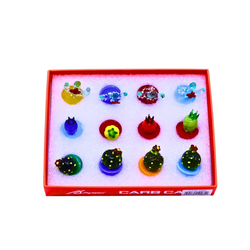 APEX PREMIUM GLASS CARB CAP ASSORTED DESIGNS DISPLAY OF 12 (CCP500) Optimize your dabbing experience with the APEX Premium Glass Carb Caps , featuring assorted unique designs that combine style and functionality. Crafted from high-quality, heat-resistant glass , these carb caps ensure efficient airflow control and excellent heat retention, providing smooth and flavorful vaporization. Compatible with most standard quartz bangers and dab rigs, they are a must-have accessory for any setup. Packaged