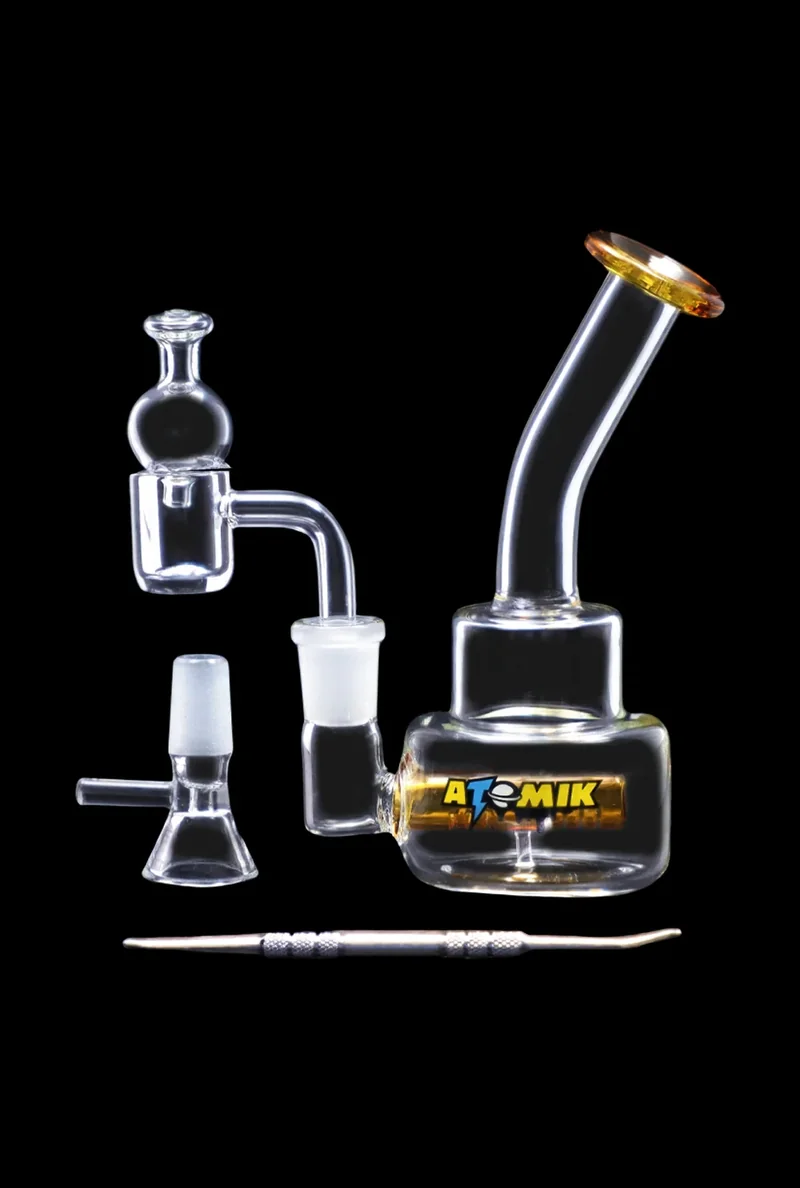 The Atomik Comet Dab Rig is here to streak across your sessions with style and performance! At 5.5 inches tall, this compact rig is the perfect companion for smooth, streamlined hits that feel truly out of this world. With its nearly dragless design, the Comet delivers an effortless dabbing experience that will leave you orbiting in bliss. Complete with all the essentials—a quartz banger, herb bowl, carb cap, and stainless-steel dab tool—the Comet is fully equipped for versatile use, whether you're dabbing concentrates or enjoying dry herbs. Sleek, efficient, and built for intergalactic adventures, it’s the shining star of your collection. Key Features & Benefits Compact Design (5.5 in.): Small enough for portability while delivering stellar performance. Dragless Experience: Streamlined design ensures effortless pulls and smooth hits every time. All-Inclusive Accessories: Includes a quartz banger, herb bowl, carb cap, and stainless-steel dab tool for maximum versatility. Durable Glass Build: High-quality glass construction ensures long-lasting reliability and easy maintenance. Modern Aesthetic: A sleek and minimal design that’s sure to light up your collection. Let the Atomik Comet Dab Rig blaze through your sessions with its out-of-this-world performance and style. It’s time to take your setup to a whole new galaxy!