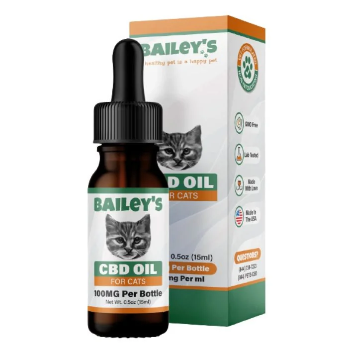Bailey's veterinarian formulated full spectrum hemp CBD oil for cats is the perfect addition to your cat's daily routine. Our veterinarian formulated CBD oil cat tinctures are made from non-GMO, phytocannabinoid-rich hemp that is small family farm-sourced, grown with love and hand-harvested in Boulder, Colorado. We use a subcritical C02 process to extract our CBD oil and 3rd party tested every batch to ensure quality & your pet's safety. This bottle is specially formulated for felines (cats) under the advisory of our consulting veterinarian Dr. Robert J Silver. Many pet owners observe the best results with consistent daily use. Our 100MG bottle is a great choice if you are looking for value per MG of CBD. This bottle is an average one-month supply when used twice daily. Every order is backed by our 30-day satisfaction guarantee, so you can buy with confidence. And you can feel good about your purchase because Bailey's donates 1 bottle for every 4 sold to a rescue dog in need.