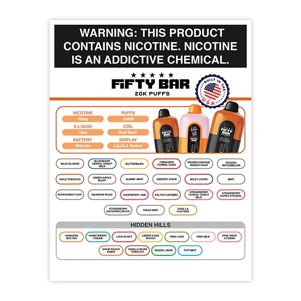 MARKETING MATERIALS The Fifty Bar 20K Laminated Flavor Card provides a durable yet appealing list of flavors for the new, Fifty Bar 20K vape line. Limit: 5 per store. Dimensions: 8 1/2" X 11" View more Marketing Materials for all brands here