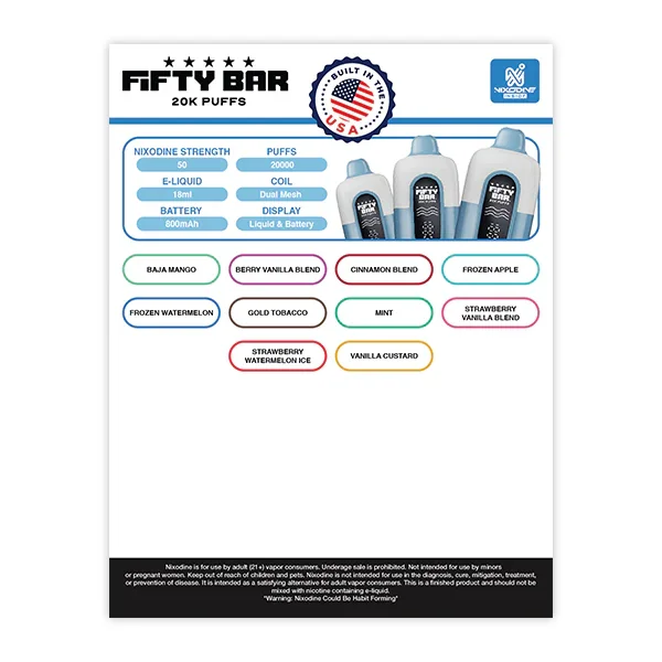 Fifty Bar 20K MARKETING MATERIALS Showcase the full range of flavors for the USA-Assembled Fifty Bar 20K vape collection with this laminated flavor menu . Designed for durability and visual appeal, this menu highlights the many features of this US-filled disposable vape and its flavors formulated by American masters. The 8.5" x 11" laminated design is for business owners to educate their customers and ensures the menu withstands daily use in vape shops , smoke shops and convenience stores. It will help your customers easily explore the variety of available flavors. Perfect for in-store displays, this flavor menu adds a professional touch to your vape section. Port City Wholesale vapes , hardware, e-liquids, and alternative products offer great value with bespoke marketing materials for your brick and mortar store. Key Features: Dimensions: 8.5" x 11" Laminated for durability and long-lasting use Features Fifty Bar 20K disposable Vape Displays a full list of flavors for customer convenience Limit: 5 menus per store View more Marketing Materials for all brands here
