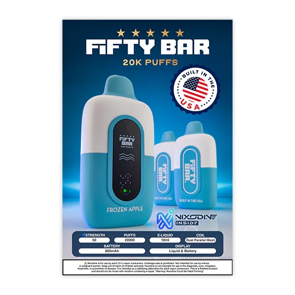 FIFTY BAR NIXODINE 12 x 18 Display Poster Showcase the FIFTY BAR NIXODINE with this striking 12-inch by 18-inch poster , perfect for drawing attention to this high-demand product. The USA-filled Fifty Bar Nixodine is a premium product which uses Nixodine in place of nicotine to provide a satisfying experience for 21+ vapor consumers. Nixodine is a patented product. Designed to make an impact in your storefront windows or interior displays , this poster highlights the premium quality and style of this popular product. A must-have marketing tool for vape shops, smoke shops, and convenience stores looking to boost visibility and sales for this impressive product line. Key Features: Dimensions: 12" x 18" Promotes the Fifty Bar Nixodine Nixodine is a patented formula that provides satisfaction similar to nicotine. Ideal for store windows and in-store displays Eye-catching design to increase customer interest and sales Limit of 2 posters per order Branded Marketing Materials