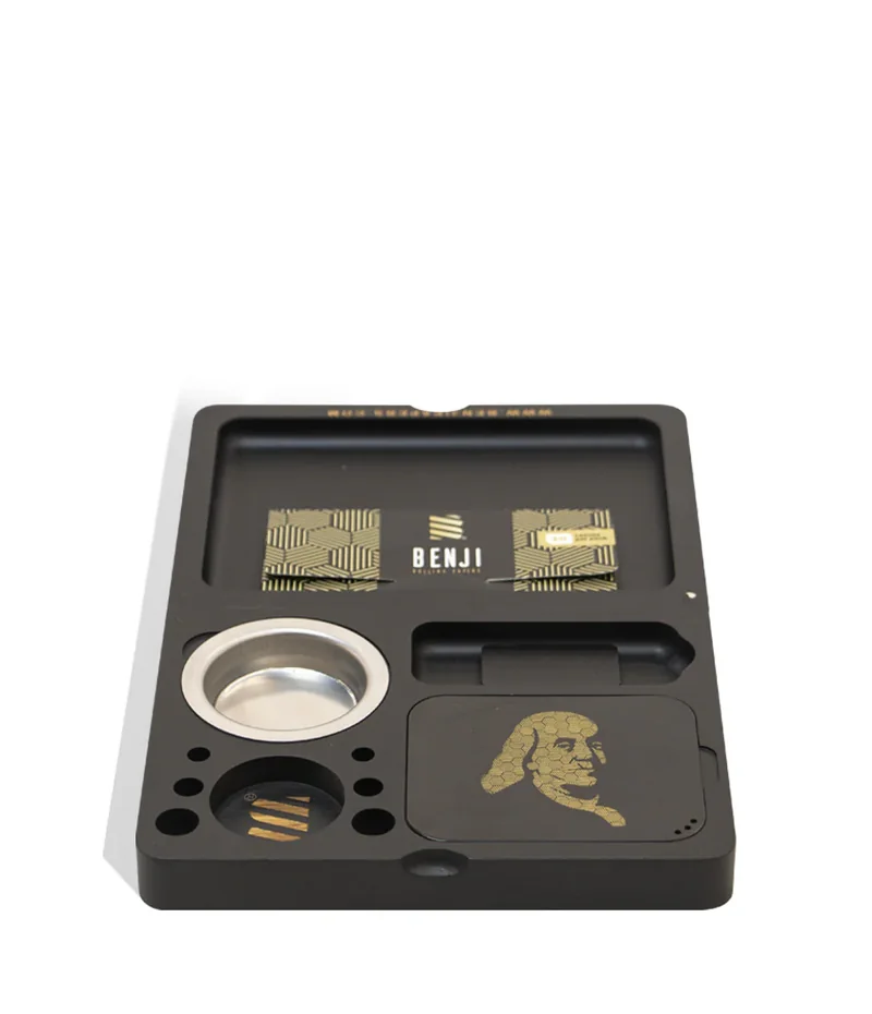 Rollin’ with Benji Introducing the Benji OG Bankroll Mini Bamboo Rolling Tray Kit is a premium kit, carefully crafted with eco-friendly bamboo material, known for its durability and sustainability. The compact size of the tray makes it perfect for on-the-go use, allowing you to roll your joints or pack your bowls wherever you are. The tray features a sleek and stylish design with the iconic Benji OG branding, adding a touch of personality to your smoking sessions. It comes complete with a set of rolling papers, filter tips, and a convenient storage compartment for your herbs or concentrates. The smooth surface of the tray provides an ideal workspace for preparing your smoking materials, while the raised edges prevent any spills or mess. Benji OG is known for their passion for the plant and dedication to promoting its benefits, Benji OG has become a trusted name among the industry. With extensive knowledge and experience, Benji OG has earned a reputation for providing valuable insights, tips, and recommendations related to cannabis consumption, cultivation, and lifestyle. What’s Included: (1) Rolling Papers (1) Rolling Area (1) Aluminum Ashtray (1) Lighter Slot (1) Scooper (1) Jar/Grinder Slot (1) Cone Holder (1) Stash Area with Metal Airtight Lid