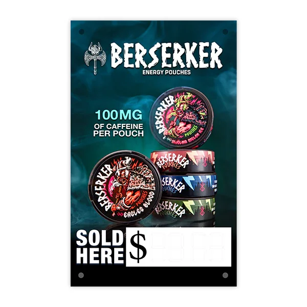 Berserker Caffeine Pouches Vinyl Banner - 15"x24" - Durable Indoor & Outdoor Marketing Display Boost your store’s visibility with this high-quality Berserker Caffeine Pouches vinyl banner . Measuring 15 inches by 24 inches , this banner is designed for maximum impact in both indoor and outdoor settings . Featuring 4 pre-installed grommet holes , it’s easy to hang in multiple locations like windows, walls, or outdoor displays. The durable vinyl material ensures long-lasting use, even in challenging weather conditions. Ideal for vape shops and retail environments . Limit of 2 banners per order . Key Features: Dimensions: 15" x 24" Durable vinyl material for indoor and outdoor use 4 grommet holes for versatile hanging options Weather-resistant design for longevity Perfect for vape stores, retail stores, smoke shops and promotional displays View more Marketing Materials for all brands here