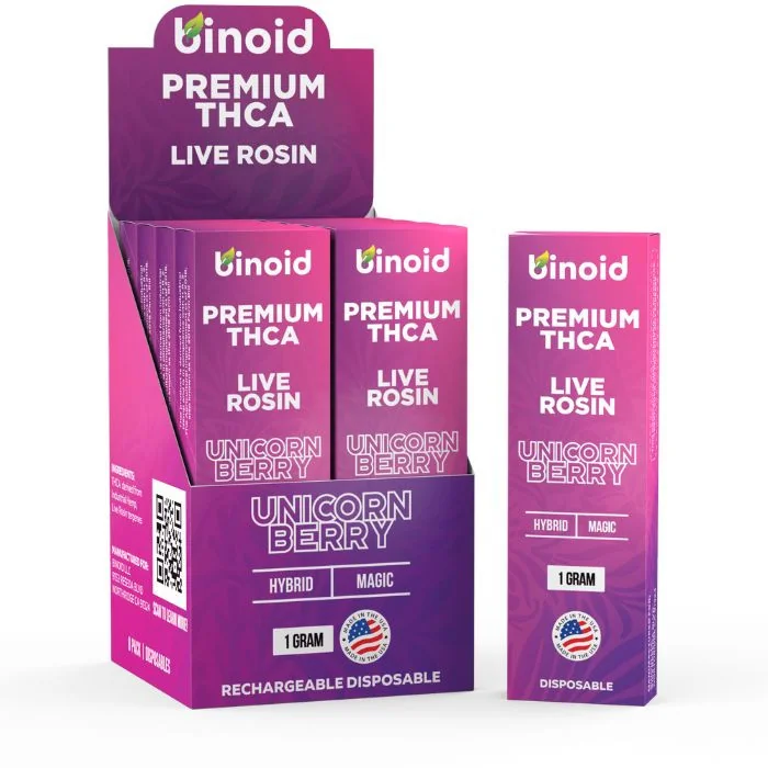This product cannot be shipped to CA. Discover the groundbreaking innovation in vaping with our Binoid Live Rosin THC-A Disposable Vape 1G. As the first of its kind, this exceptional vape combines 99% premium THCA distillate with live rosin cannabis terpene strains, delivering a superior experience beyond regular vapes. THCA offers remarkable potency, rivaling Delta 9, and when paired with live rosin, it provides an unparalleled terpene flavor and taste. These high-quality vapes are crafted for those who seek the best in the market. Binoid THCA Live Rosin Disposable Vapes are rapidly gaining popularity for their exceptional live terpene flavors. Users can expect an extraordinary buzz and a unique experience. Don’t be deceived by its size; this THCA disposable packs a powerful punch. Flavors Fruit Spirit (Sativa): Enjoy a refreshing and uplifting sativa blend that combines fruity notes for a vibrant vaping experience. Sour Pebbles (Sativa): Dive into a tangy and invigorating sativa mix that bursts with sour, citrus flavors. Space Cake (Indica): Indulge in a deeply relaxing indica strain with the sweet and creamy taste of a baked delight. Strawberry Milk (Hybrid): Savor a balanced hybrid with the delicious blend of ripe strawberries and creamy milk. Unicorn Berry (Hybrid): Experience a magical mix of berries in this hybrid strain, offering a perfect balance of flavor and effects. Watermelon OG (Indica): Relax with the smooth and juicy watermelon flavor of this potent indica strain.
