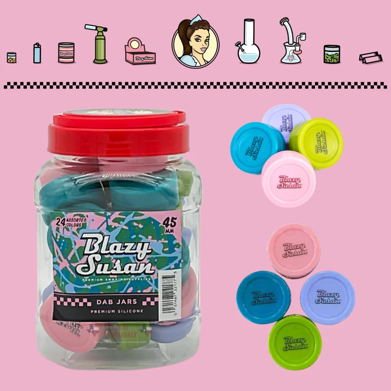 BLAZY SUSAN 45MM SILICONE DAB JAR DISPLAY OF 24 Blazy Susan now has dab jars! These cute silicone jars are the best way to store your various dabs and concentrates to keep them fresh and ready to go. Available in 4 colors and 2 sizes, there’s a jar for every dabber. Grab a few incase you lose one or if you want to share with friends!
