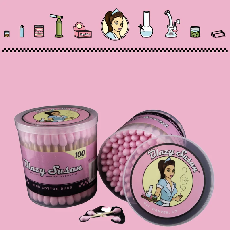 BLAZY SUSAN BLAZY COTTON BUDS 100CT à BLAZY PINK COTTON BUDS ARE DESIGNED FOR THE SERIOUS CONCENTRATE CONNOISSEUR WHO LIKES TO KEEP THEIR QUARTZ CLEAN AND SPARKLING AFTER EACH USE. OUR TRIPLE WRAPPED COTTON BUDS ARE COLORED WITH NATURAL FOOD SAFE DYE THAT WON’T LEAVE ANY RESIDUE OR TASTE AFTER USE. HIGHLY ABSORBENT WITH A STURDY BAMBOO STICK, WHAT MORE COULD YOU ASK FOR IN A COTTON SWAB? THESE STURDY PINK Q-TIPS WILL BE UP FOR ANY TASK YOU THROW AT THEM.