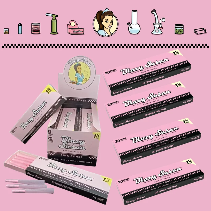 BLAZY SUSAN PINK PRE-ROLLED CONES 1 1/4 SIZE 20CT DISPLAY OF 12 Add a pop of color and convenience to your smoking experience with Blazy Susan Pink Pre-Rolled Cones. These 1 1/4 size cones are made from high-quality, ultra-thin paper, designed for smooth and even burning. Perfect for those who want a stylish yet practical option, these pink cones are easy to pack and ideal for both beginners and seasoned users. Each display includes 12 packs, with 20 pre-rolled cones per pack, making it perfect