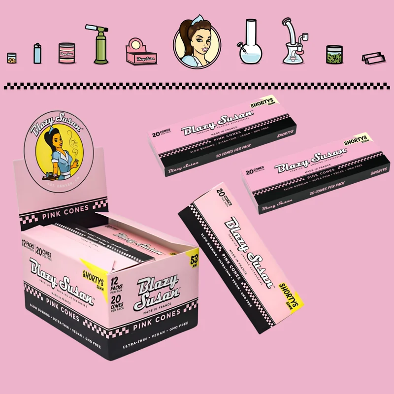 BLAZY SUSAN PINK PRE-ROLLED CONES SHORTYS 53 MM 20CT DISPLAY OF 12 Make a bold statement with Blazy Susan Pink Pre-Rolled Cones in a compact 53mm size. These vibrant cones are crafted from high-quality, ultra-thin paper to deliver a smooth, even burn every time. Their petite size makes them perfect for shorter sessions or those who prefer a more compact option. Each display includes 12 packs, with 20 pre-rolled cones per pack, making it a stylish and practical choice for retail or personal use.