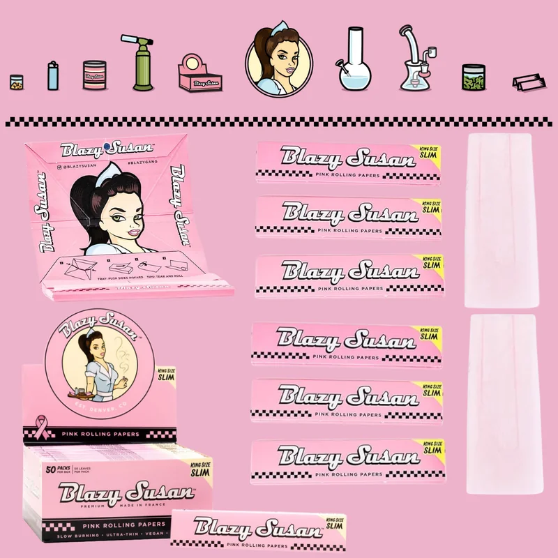 BLAZY SUSAN PINK ROLLING PAPERS KING SIZE 50CT/PACK SMOKE THE BEST ROLLING PAPERS IN STYLE WITH BLAZY PINK PAPERS. PROUDLY VEGAN & NON-GMO, MADE WITH ORGANIC PIGMENTS AND SOURCED AT A REPUTABLE FRENCH FACTORY. MADE IN A REPUTABLE FRENCH FACTORY KING SIZE SLIMS SMOOTH AND SLOW BURNING SUPER THIN NATURAL DYE VEGAN, NON-GMO & HIGH QUALITY à