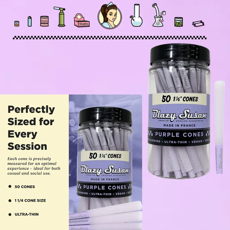 The BLAZY SUSAN PURPLE 1 1/4 CONES - 50CT JAR delivers a quality smoking experience backed by Blazy Susan's reputation. This cone features premium materials for smooth airflow and even burning. A staple product for any well-stocked smoke shop. Wholesale quantities at Port City Wholesale.