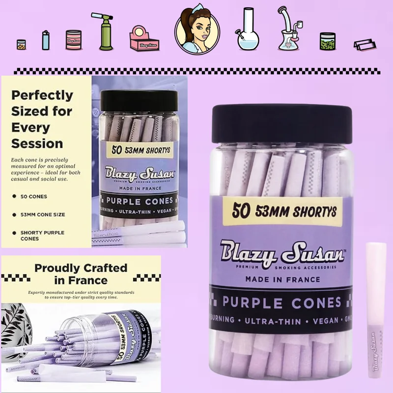 BLAZY SUSAN PURPLE EDITION 53MM SHORTYS CONES JAR OF 50 — Blazy Susan's premium cone designed for the discerning smoker. Crafted with quality materials for a clean taste and consistent burn rate. This product offers great value for stocking retail shelves or personal use. Available at wholesale from Port City Wholesale.