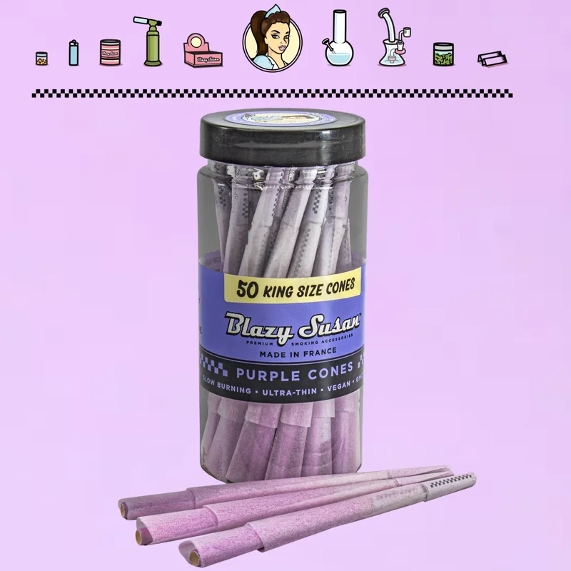 The BLAZY SUSAN PURPLE KING SIZE CONES - 50CT JAR by Blazy Susan is a premium cone crafted with quality materials for a smooth, even burn. This 50CT package offers excellent value for regular users and retailers alike. Roll with confidence using products designed for consistency and quality. Wholesale pricing available at Port City Wholesale.