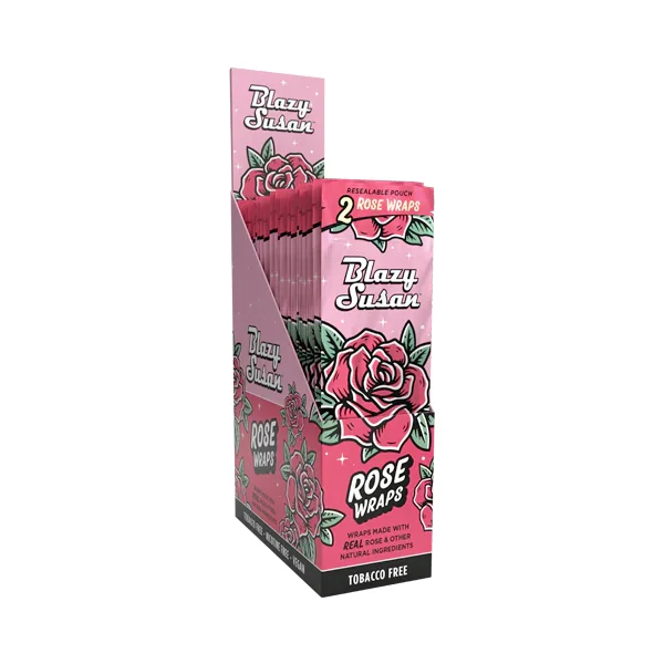 Blazy Susan Rose Wraps (2ct) — Display of 25 Bring a fresh floral twist to the wrap lineup with Blazy Susan Rose Wraps . Crafted from wood-based papers infused with rose extracts , these wraps deliver a smooth roll and a light, aromatic rose profile that elevates the session without overpowering it. Each pack includes 2 wraps , and this wholesale unit comes as a display of 25 —perfect for countertop merchandising and quick grab-and-go sales. Blazy Susan Rose Wraps Specifications Wood-based paper infused with rose extracts Wrap Dimensions: 2 × 6.5 × 0.5 in Floral, aromatic experience with a smooth burn 2 wraps per pack (2ct) Wholesale display: 25 packs per display