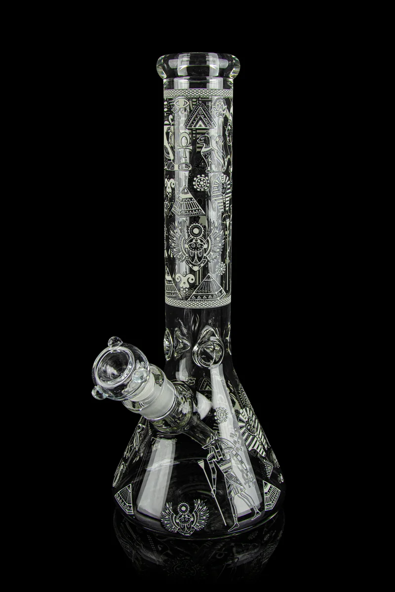 Light up your night seshes in glorious fashion with this nice ice bong by Bongs USA. This beast of a bong is made with heavy thick glass and stands an impressive 14-inches tall. It features a 18.8mm female joint and comes with a 18.8mm>14.5mm removable diffuser downstem to smooth your rips and a 14.5mm male herb bowl. You can use the integrated ice catcher to add a frosty edge to your rips. The best part of this bong is the glow in the dark graphics depicting various Egyptian deities. The Egyptian Deities Glow in the Dark Bong is one solid piece that's a joy to use and look at. The mouthpiece is flared to ensure your comfort and the wide beaker base keeps it stable.