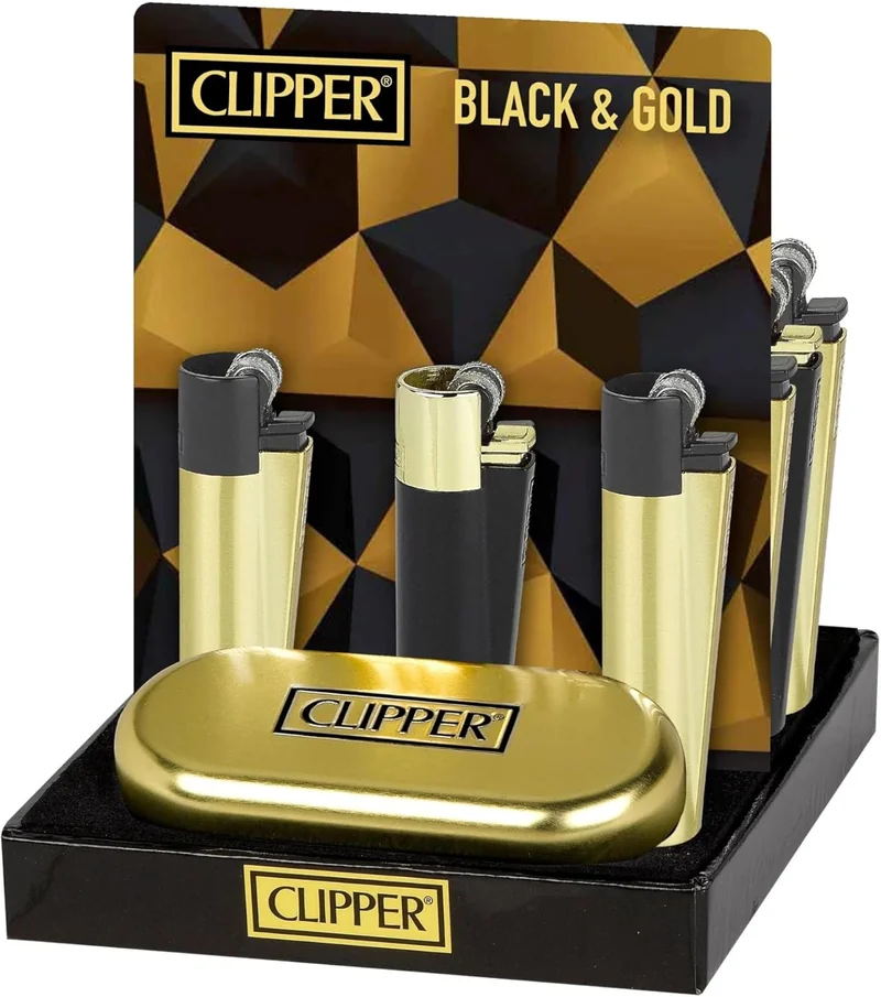 CLIPPER METAL MATTE BLACK & GOLD LIGHTER DISPLAY OF 12 (CLIPPER-35) Build for Durable Reusability Full Metal Body Refillable Gas + Flint Helpful Packing Tool Iconic shape designed with a smoker in mind Lighter Dimension: 2.5in x 0.55 in
