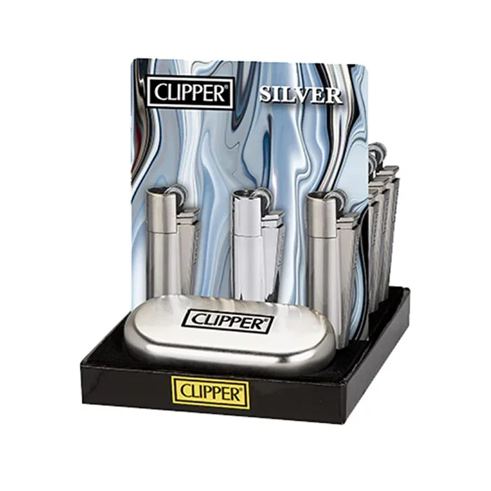 CLIPPER METAL MATTE SILVER LIGHTER DISPLAY OF 12 (CLIPPER-34) Build for Durable Reusability Full Metal Body Refillable Gas + Flint Helpful Packing Tool Iconic shape designed with a smoker in mind Lighter Dimension: 2.5in x 0.55 in