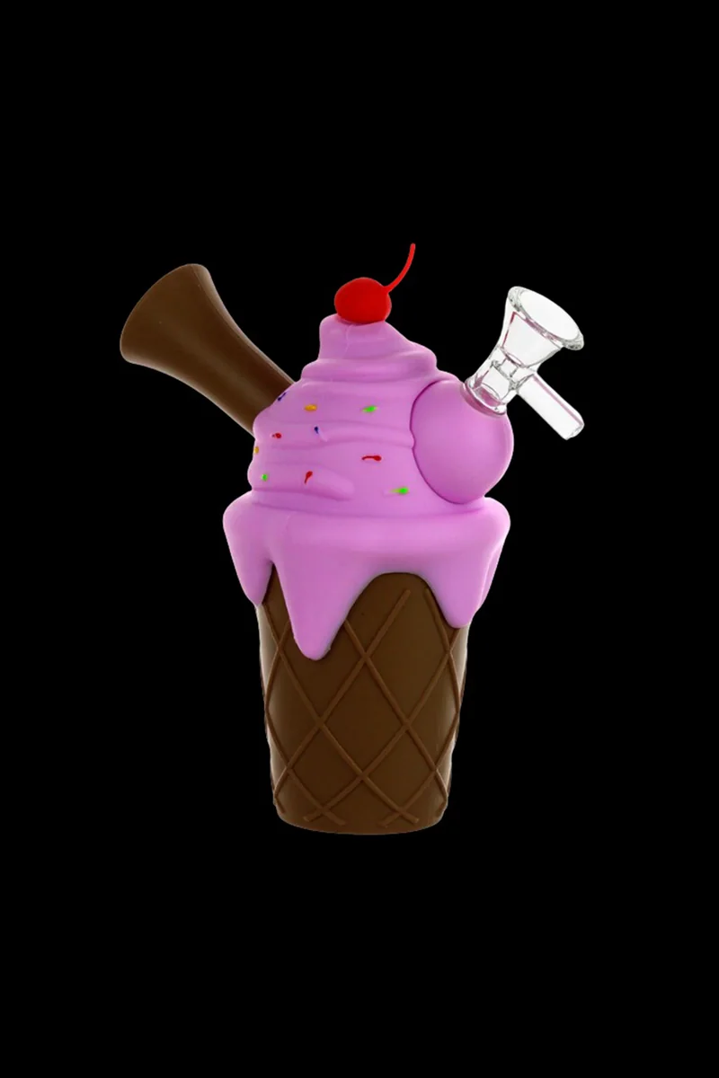 Your smoke sessions will be sweeter when you use the Cloud 8 Silicone Ice Cream Sundae Water Pipe ! This 6”H x 3”W water pipe is designed like a delicious ice cream sundae complete with a cherry on top for some extra sweetness. Made of virtually indestructible silicone, this pipe is as durable as it can be, plus it weighs just 8-ounces, making it easy to handle. It’s equipped with an angled mouthpiece for comfortable puffs and comes ready to use with a handled funnel-style glass herb slide.