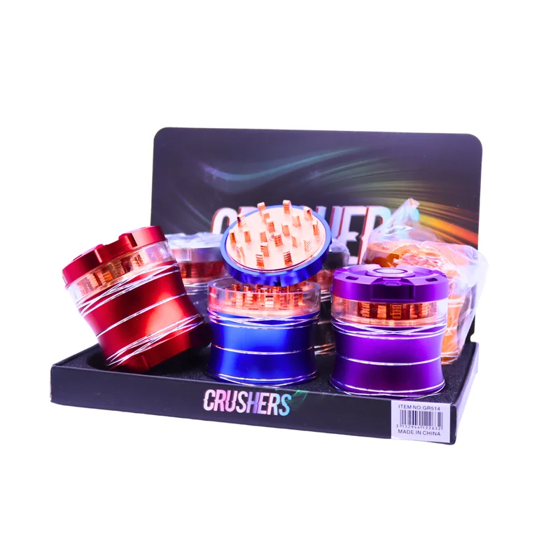 The Crushers Premium 4 Parts 65mm Grinder with an Elegant Curve Design is a perfect blend of style and performance. This high-quality grinder features a 4-part construction , including grinding chambers, a pollen catcher, and storage compartments, ensuring smooth and efficient operation. Its 65mm size offers ample capacity for grinding, while the elegant curves enhance its aesthetic appeal. The display of 6 is ideal for retailers seeking stylish and functional grinders for their customers. Featu