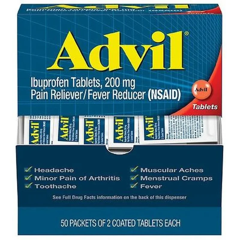 Disclaimer: These statements have not been evaluated by the U. S. Food and Drug Administration. This product is sold as a dietary supplement only and is not intended to diagnose, treat, cure, or prevent any disease. By using this product, you accept full responsibility for any adverse events or health complications. Individual results may vary. Advil stops pain where it starts, providing a powerful pain reliever. Whether you have a headache, muscle ache, backache, toothache, menstrual pain, minor arthritis and other joint pain, or aches and pains from the common cold, Advil brings relief where you need it. 50x2 packets of Advil Pain Reliever and Fever Reducer coated tablets, with ibuprofen 200mg for pain relief Advil ibuprofen pain reliever provides powerful relief Headache medicine, back pain medicine and joint or minor arthritis pain reliever that also provides menstrual pain relief and relief of muscle aches for adults and children 12 years and older Coated Advil tablets are easy to swallow pain relievers, providing relief that lasts for up to 6 hours Take these 200mg ibuprofen tablets as directed HSA and FSA eligible product An essential item for your breakroom or supply closet. Safety Notice: Consult your healthcare provider before use if you have any medical conditions ( including liver, kidney, or heart issues) or are taking prescription medications, over- the- counter drugs, or other supplements. Do not exceed the recommended dose. Do not operate heavy machinery or drive after use if you experience drowsiness, dizziness, or other impairing effects. Not for use by pregnant or nursing women. Keep out of reach of children. Storage: Store in a cool, dry place away from direct sunlight and extreme temperatures. Always reseal tightly after opening.