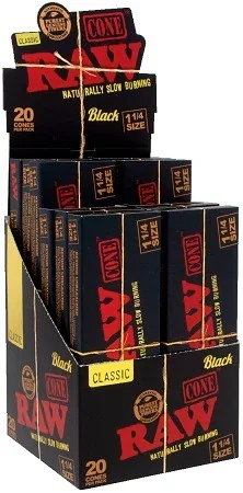 RAW AUTHENTIC CLASSIC BLACK CONES 1 1/4 Size 20 Pack (12 Count Display) MSRP $9.99 Per Pack RAW Black is pressed extra-fine to be our thinnest, slowest burning cones EVER! These RAWESOME beauties are hand-rolled and deserve your very best material. RAW Black Cones – 1¼ (84 mm) Classic Black 1-1/4 Size | These cones are 84mm (3.3 inches) long with a 26mm tip. This paper is pressed ultra thin, almost translucent, to allow for a smooth, amazing taste. Can't Roll? | Forget rolling papers and get your swagger back with these pre-rolled cones & tips! Just fill, pack, and enjoy in half the time it used to take to roll without any mess or hassle! RAWthentic | 100% Authentic Raw pre-rolled cones that are unbleached with no added chalks or dyes and a natural tree sap gum line. Produced by RAW & repackaged by Green Blazer as a kit. Slow Burning Classic Black Paper Series | Each cone is watermarked with RAW'sHBI proprietary criss-cross imprint maintaining a smooth burn, without any runs or harshness. What You Get | 20 RAW Black 1-1/4 Size pre rolled cones, packing sticks, case, & Raw funnel cone loader included in every set for a complete DIY rolling kit! 20 Cone Per Pack 12 Pack Per Display