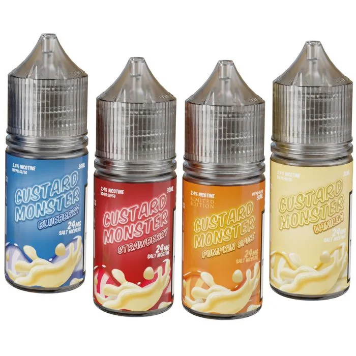 Custard Monster Nicotine Salts deliver rich, creamy custard flavors in convenient 30mL bottles. Available in 24mg and 48mg nicotine strengths, they’re perfect for pod systems. Crafted by Monster Vape Labs, these salts offer a smooth, satisfying vape with premium quality ingredients. Custard Monster Nicotine Salts Features: Flavor Profile: Delivers the same rich, creamy custard goodness as the e-liquid version, with flavors like Vanilla and Butterscotch. Bottle Size: Available in 30mL bottles, ideal for portable vaping. Nicotine Strengths: Offers 24mg and 48mg strengths for a more potent nicotine experience. Perfect for Pod Systems: Specifically designed for low-wattage pod systems, delivering a satisfying and smooth hit. High-Quality Ingredients: Made with premium ingredients for a rich and authentic custard flavor. Developed by Monster Vape Labs: Produced by a leading manufacturer in dessert vapes, ensuring quality and consistency. Custard Monster Nicotine Salts Flavors: Banana: Smooth, creamy custard blended with ripe, sweet bananas for a delectable dessert vape. Blackberry: Tart blackberries mixed with velvety custard for a perfectly balanced and luscious flavor. Blueberry: Juicy blueberries combined with rich custard, creating a sweet and creamy delight. Butterscotch: Decadent butterscotch swirled into a creamy custard for a rich, indulgent vape experience. Mixed Berries: A medley of berries blended into a smooth custard, offering a burst of fruity sweetness with every puff. Pumpkin Spice: Warm pumpkin spice custard, perfect for cozying up with a comforting and flavorful vape. Strawberry: Sweet strawberries infused into a creamy custard for a classic and satisfying flavor. Vanilla: Classic vanilla custard, delivering a smooth and rich flavor that’s timeless and delicious. Strawberry Vanilla: Combines the strawberry and vanilla flavors. Blueberry Vanilla: Combines the blueberry and vanilla flavors. Creamsicle: combines the creamy flavor