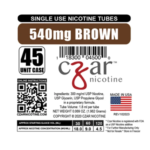 Brown Czar Nicotine Single Serve Tubes 540MG (Pack of 45) — quality product from Czar Nicotine. Built for real use, not just for show. Practical design that customers keep coming back for. Size: 540mg. Suggested retail: $182.99.