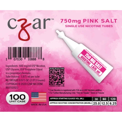 The Pink Salt Czar Nicotine Single Serve Tubes 750MG (Case of 100) from Czar Nicotine is a quality product built to perform. Solid construction and practical design make this a reliable choice for your collection or retail shelf. Size: 750mg. Suggested retail: $303.99.