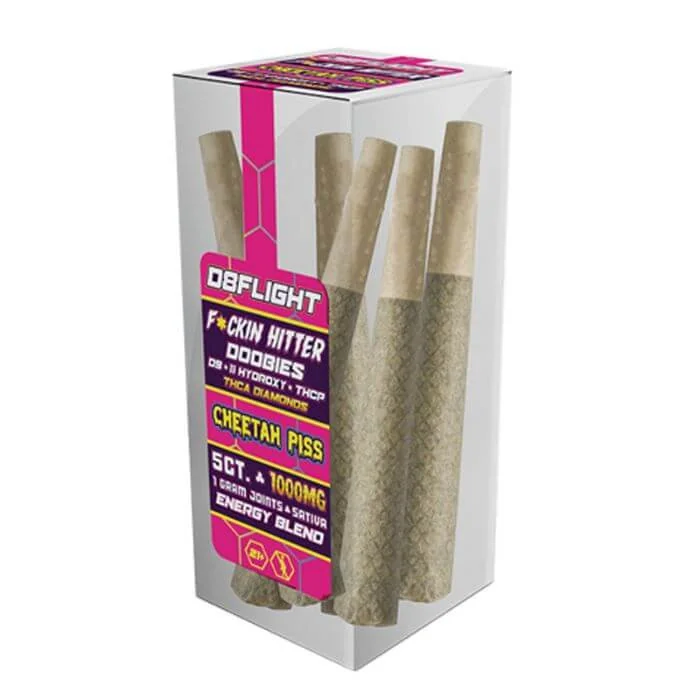 Unwind with the Pre roll 200mg Doobies 5ct Jars, offering a smooth, powerful smoking experience for ultimate relaxation. Each pre-roll contains 200mg of THC, delivering a balanced, calming effect that’s perfect for unwinding after a long day or enjoying a quiet evening. Key Features: 200mg THC per pre-roll: Powerful, smooth experience in every puff. Convenient 5ct jar: Perfect for on-the-go use or sharing with friends. Relaxing effects: Ideal for unwinding and stress relief. Flavor List: AK-47 (Hybrid): A balanced, smooth smoke with earthy and spicy notes. Bubba Kush (Indica): Rich, relaxing flavor with a sweet, earthy finish. Cheetah Piss (Sativa): A tangy, citrusy flavor with energizing effects. Cherry Pie (Hybrid): Sweet and tart with a smooth, relaxing aftertaste. Death Star (Indica): Bold, earthy flavor with a potent, relaxing high. Grape Ape (Indica): Sweet grape flavor with a calming, sedative effect. Green Crack (Sativa): Energizing, citrusy flavor with a sweet finish. Gorilla Glue (Hybrid): A rich, earthy flavor with a relaxing, balanced high. Maui Wowie (Sativa): Tropical, fruity flavor with a bright, uplifting effect. Pineapple Doobies (Sativa): Sweet pineapple flavor with a refreshing, energizing effect. Order your D8Flight F*ckin Hitter Pre Rolls 0.2G 5ct Jars today and enjoy a smooth, potent experience with every puff!