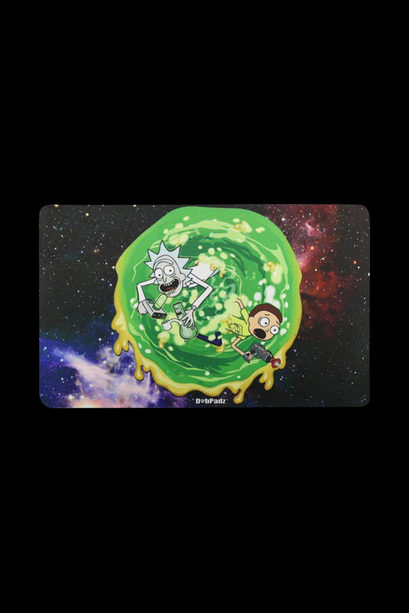You don't need a portal gun to shoot yourself into another dimension, just loading your favorite piece will do. And this Richard & Marty Wax Portal dab mat will prevent accidents once you do. DabPadz is the original dab mat, created to personalize your sessions and keep your glass pieces safe from damage. They achieve that with the neoprene rubber construction, which is shock absorbent and heat-resistant and creates a perfect cushioned surface for your rig, water pipe and tools. The fun cartoon-inspired illustration is screen printed on the fabric top, and features our favorite duo emerging from a waxy portal into a new dimension. This cool mat measures 16 by 10 inches, and is a great way to personalize your own collection or to surprise a fellow Rick & Morty fan.