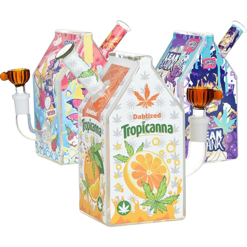 DABTIZED JUICE CARTON GLASS WATER PIPES ASSORTED DESIGNS Indulge in a whimsical dabbing experience with the Dabtized Juice Carton Glass Water Pipes, available in assorted designs. Crafted with creativity and functionality in mind, these water pipes combine novelty aesthetics with premium performance. Each piece is meticulously handcrafted from high-quality borosilicate glass, ensuring durability and optimal flavor preservation. Whether you're a seasoned enthusiast or a casual dabber, these water
