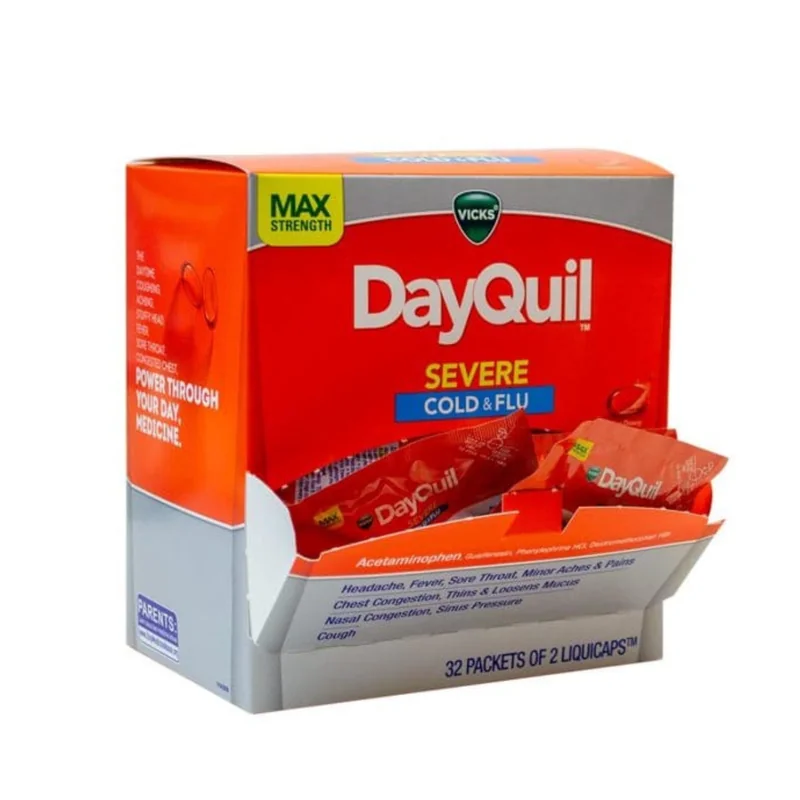 DAYQUIL SERVE MAX STRENGTH COLD & FLU 32 PACKETS OF 2 LIQUICAPS Get fast and powerful relief from cold and flu symptoms with DAYQUIL SEVERE MAX STRENGTH COLD & FLU 32 PACKETS OF 2 LIQUICAPS. These maximum strength liquicaps are formulated to combat your worst cold and flu symptoms, including nasal congestion, cough, sore throat, headache, fever, and body aches. Conveniently packaged in individual packets, each containing 2 liquicaps, this product is perfect for on-the-go relief, en