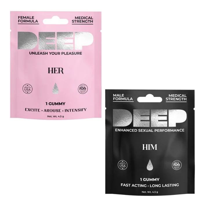 Unlock passion and performance with DEEP, the premium enhancement line designed for both women and men. Using a proprietary blend of libido-boosting botanicals and herbal terpenes, DEEP delivers fast-acting results that fuel confidence, energy, and long-lasting satisfaction. For Her – Female Enhancement Gummies Indulge in sweet, juicy strawberry gummies that go beyond flavor. Within minutes, DEEP’s female enhancement formula boosts arousal, sensitivity, and sensual energy—helping you embrace hours of heightened pleasure. Convenient, discreet, and delicious, DEEP gummies are the perfect way to naturally enhance desire. For Him – Male Performance Strips When it’s time to rise to the occasion, DEEP male performance strips hit fast and hit hard. Engineered for stamina and confidence, each sublingual strip dissolves quickly for maximum absorption and rapid activation. Designed for on-the-go convenience, DEEP strips give you undeniable presence and control—every single time.