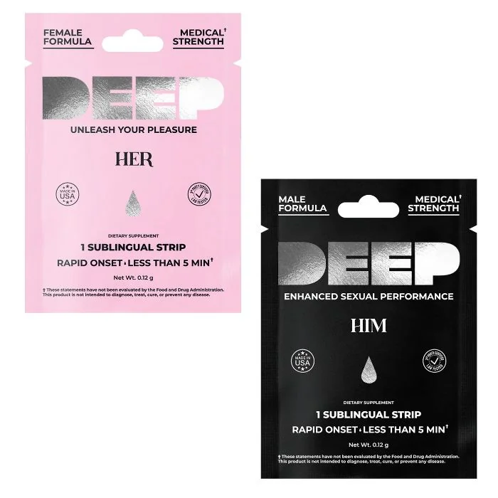For Him – Male Performance Strip Engineered for stamina and strength, the male performance strip hits fast and hits hard. Designed to boost endurance, confidence, and undeniable presence, this powerful formula activates within minutes, keeping you in control from start to finish. For Her – Female Arousal Strip Crafted for intensity, the female arousal strip ignites desire from the first spark to the final rush. With its fast-acting sublingual delivery, it heightens sensation, amplifies arousal, and empowers women to fully embrace their sensual energy. You bring the spark—DEEP brings the fire. Whether you’re shopping retail or stocking wholesale for vape shops, adult wellness stores, or online distribution, DEEP Performance Strips are a customer favorite for their convenience, taste, and proven results. Available Options: Male Performance Strip – Strong, discreet, and fast-acting stamina support. Female Arousal Strip – Delicious, empowering, and designed to intensify pleasure.