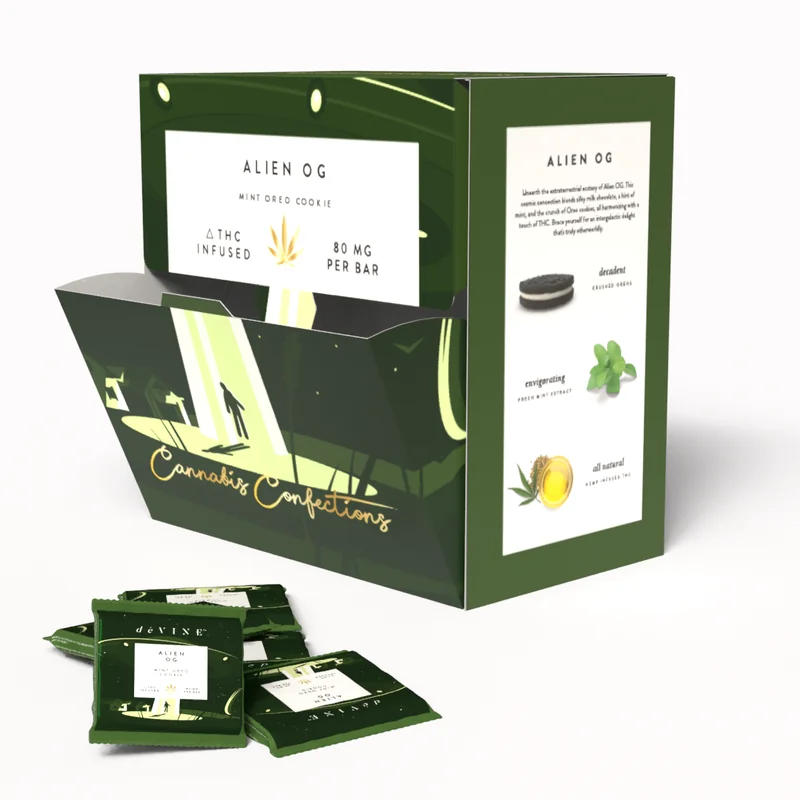 Indulge in the perfect balance of flavor and potency with Cannabis Confections by deVINE. Each bar delivers 300mg of hemp-derived THC, split into 15 convenient 20mg servings, ideal for both individual enjoyment and retail shelves. Crafted with premium ingredients and inspired by popular cannabis strains, these THC-infused chocolate bars are designed to satisfy your cravings while delivering a smooth, consistent high. Flavor Descriptions: Alien OG – A cosmic fusion of mint chocolate and Oreo crunch that’s truly out of this world. Cereal Milk – A nostalgic blend of creamy sweetness and crunchy cereal for that morning-after munchie feel. Girl Scout Cookie – Marshmallow and graham cracker flavors wrapped in milk chocolate—pure edible nostalgia. Peanut Butter Pie – Creamy peanut butter meets silky chocolate in this rich, dessert-style edible. White Runtz – Sweet, tropical white chocolate with a candy-like finish, inspired by the popular hybrid strain.