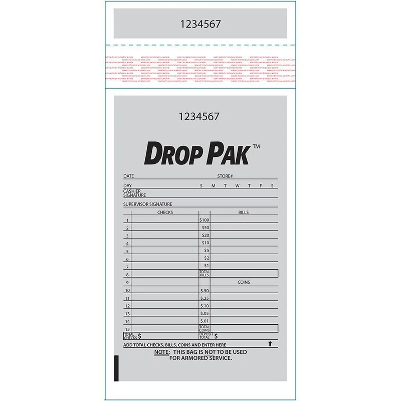 Small and economical, the Dunbar DropPak is a cost-effective solution for providing an added layer of internal cash control within any business. Eliminate usage of paper envelopes when performing sensitive tasks such as safe drops, register skims or drawer countdowns. These tamper evident drop bags are pre-printed with a wide array of informational boxes that (when filled out correctly) provide details about the drop as well as the individual that made it. Count: 1,000 bags per box Weight 9 lbs Material Plastic Color Clear