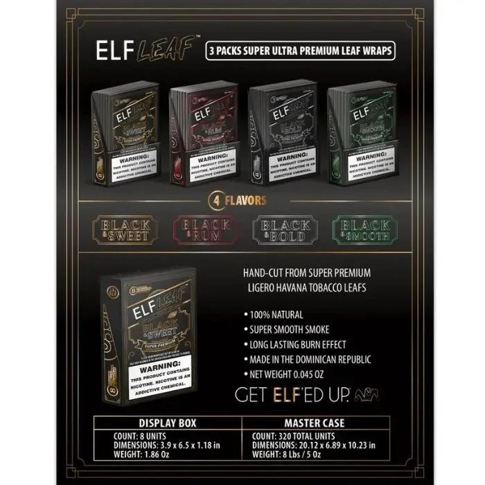 Elevate your smoking sessions with the new ELF Leaf Caviar Blunt Wraps—crafted for connoisseurs who value flavor, quality, and a clean, slow burn. Each 3-pack contains 8 premium wraps per pack, delivering exceptional value and consistency for every roll. Made from high-quality tobacco leaf and infused with rich, distinctive flavors, ELF Leaf Caviar wraps provide a luxurious experience from start to finish. Perfectly textured for easy rolling and long-lasting enjoyment, these wraps are a must-have for any smoke enthusiast. Flavor Options: Black and Bold – A robust, full-bodied profile with a deep, smoky finish. Black and Rum – Smooth and spiced with sweet rum essence. Black and Smooth – Mellow and creamy with a clean, even burn. Black and Sweet – Lightly sweetened for a rich yet smooth flavor. Whether you're rolling for a solo session or sharing with friends, ELF Leaf Caviar Wraps deliver the elevated quality you expect. Stock up today and roll with flavor.