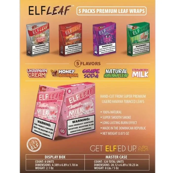 Upgrade your smoking ritual with the all-new ELF Leaf Organic Blunt Wraps—crafted for a smooth, slow burn and unmatched flavor. Each 5-pack includes 8 natural wraps, made from high-quality, organic materials designed for easy rolling and consistent performance. Perfect for flavor lovers and purists alike, these wraps offer a clean, even burn and bold taste in every session. Whether you enjoy classic profiles or creative twists, ELF Leaf Organic wraps deliver a satisfying experience from start to finish. Flavor Options: Grape Soda – Sweet and fizzy with bold grape flavor and a smooth finish. Honey Bourbon – A rich blend of sweet honey and aged bourbon. Natural Havana Leaf – Classic and earthy, ideal for traditional tobacco lovers. Strawberry Milk – Creamy and fruity with a nostalgic twist. Ukrainian Cream – Velvety and smooth with subtle, rich undertones. Perfect for daily use or special sessions, stock up on ELF Leaf Organic Blunt Wraps today and roll with premium flavor.