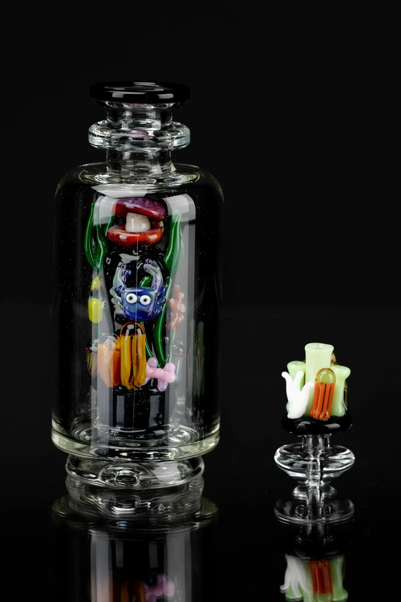 Add this incredible Save The Seas Glass Bubbler Attachment to your Puffco Peak to make your rig stand out from the crowd. This all-glass attachment made by Empire Glassworks features an amazingly detailed & colorful undersea scene with a variety of ocean creatures amidst coral and flowing seaweed. It comes with a matching carb cap to help you get the most out of your concentrates and overall vaping enjoyment. This Puffco Peak glass bubbler attachment is designed to replace the standard glass attachment that came with your Peak when it was new. It's an eye-catching piece that perfectly matches the high-end look of the Puffco Peak. The bubbler is made of thick and sturdy boro glass along with Empire Glassworks' intricate glasswork the brand is known for.