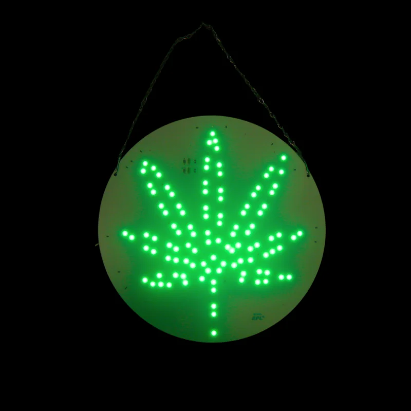 ILLUMINATED SPARKLING LED LEAF DESIGN SIGNS (15 X 15") Brighten up your space with the Illuminated Sparkling LED Leaf Design Sign (15" x 15") , perfect for smoke shops, lounges, or modern interiors. Featuring a bold leaf-inspired design illuminated with vibrant LEDs, this compact and stylish sign adds a touch of elegance and professionalism to any setting. The energy-efficient design ensures long-lasting performance while creating a visually striking ambiance. Features: Vivid LED Illumination: C
