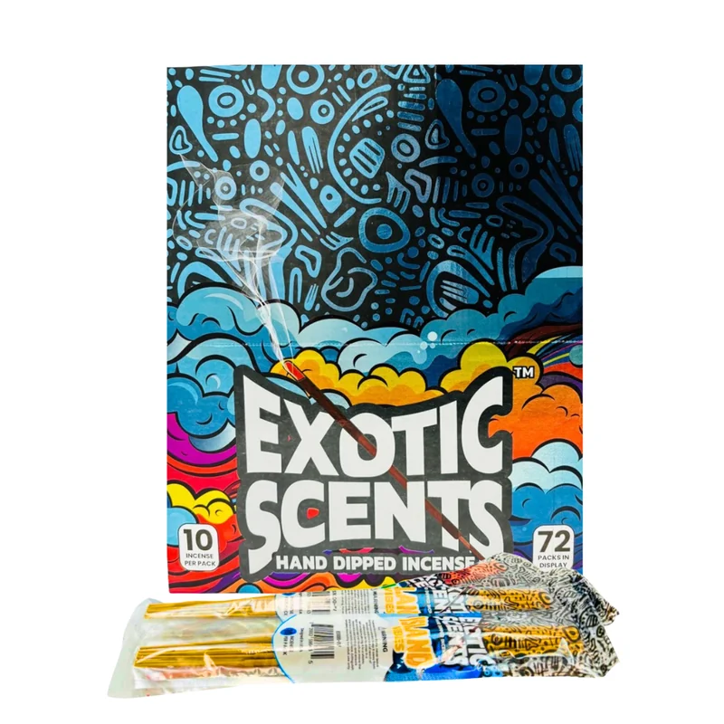 EXOTIC SCENTS HAND DIPPED INCENSE 10CT PER PACK DISPLAY OF 72 Create a calming and aromatic atmosphere with the Exotic Scents Hand Dipped Incense 10ct per Pack – Display of 72 . Each incense stick is hand dipped in premium fragrance oils , ensuring a rich, long-lasting aroma that enhances any space. Perfect for relaxation, meditation, or simply refreshing a room, these 10-stick packs are compact, portable, and retail-ready. With 72 packs per wholesale display , retailers can offer customers a wi
