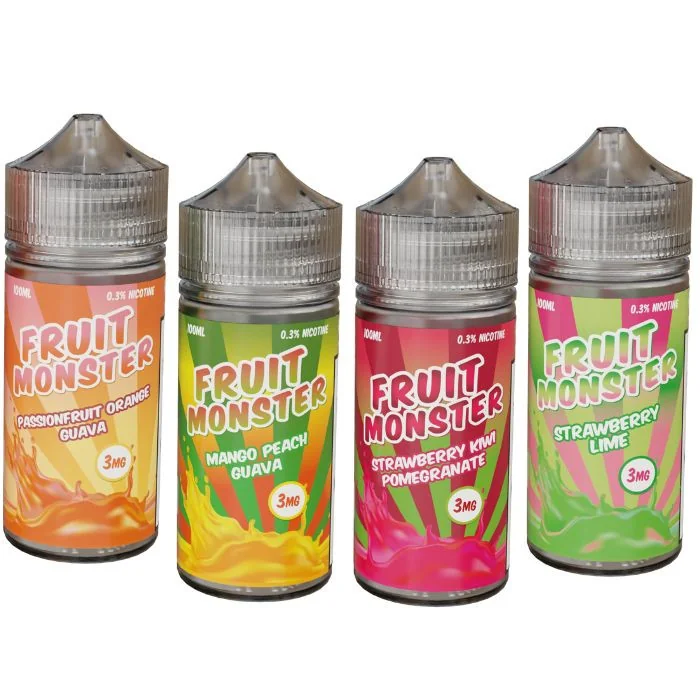 Fruit Monster E Liquid offers 100ml bottles of vibrant fruit blends like Strawberry Kiwi Pomegranate and Mango Peach Guava. Available in nicotine strengths of 0mg, 3mg, and 6mg, this e-liquid ensures a refreshing and satisfying vape. Ideal for wholesale, it provides a diverse range of flavors for a high-quality vaping experience. Fruit Monster E Liquid Features: Nicotine Strengths: Available in 0MG, 3MG, and 6MG. Bottle Size: 100ml bottles. Flavor Profile: Features vibrant and unique fruit flavor combinations such as Mixed Berry, Strawberry Kiwi Pomegranate, Mango Peach Guava, Blueberry Raspberry Lemon, and a Frozen Fruit Monster selection for an icy finish. Manufactured By: Monster Vape Labs, known for its craftsmanship and popular dessert line, Jam Monster. Craftsmanship: Created with the same high-quality standards as Jam Monster, delivering delicious, well-balanced fruity blends. Ideal for Retail: Perfect for vape stores and smoke shops seeking to offer a variety of refreshing and flavorful e-liquids. Fruit Monster E Liquid Flavors: Black Cherry: Enjoy the deep, rich taste of ripe black cherries with every puff. Blueberry Raspberry Lemon: A zesty blend of blueberries, raspberries, and lemons for a refreshing vape experience. Mango Peach Guava: A tropical mix of juicy mangoes, sweet peaches, and exotic guava. Mixed Berry: A delightful combination of assorted berries for a sweet and tangy vape. Passionfruit Orange Guava: Exotic passionfruit, tangy orange, and tropical guava come together for a vibrant flavor. Strawberry Banana: The classic blend of sweet strawberries and creamy bananas. Strawberry Kiwi Pomegranate: Juicy strawberries, tangy kiwi, and tart pomegranate create a flavorful fusion. Strawberry Lime: Fresh strawberries paired with zesty lime for a refreshing vape. Fruit Monster E Liquid Wholesale: Fruit Monster E Liquid features a wide range of fruity flavors that excite the palate. This wholesale product is perfect for vape shops seeking