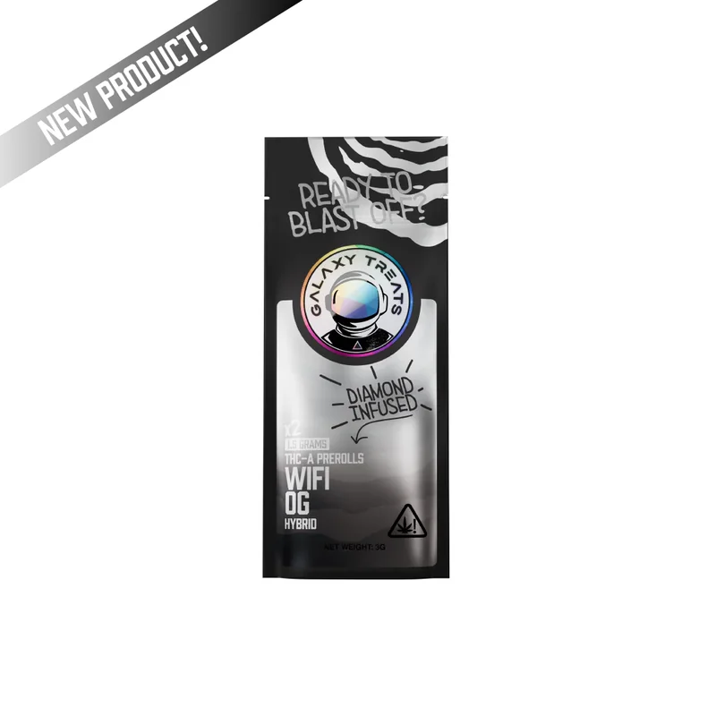 Wifi OG Diamond Infused THCA Pre-Rolls deliver a high-speed connection straight to the cosmos . This perfectly balanced hybrid hits like lightning with its Fire OG x The White genetics , now supercharged with premium THCA diamonds for maximum bandwidth . Each 1 . 5g pre-roll broadcasts flavors of diesel fuel , citrus zest , and peppery pine that ' ll have your taste buds buzzing at full signal strength . Known for its crystal-clear mental effects and energizing body buzz , Wifi OG keeps you connected to creativity without dropping your signal to couch-lock . These diamond-dusted rockets deliver the kind of potency that ' ll have you streaming pure euphoria at 5G speeds — perfect for when you need to stay online but elevated to a whole new frequency .