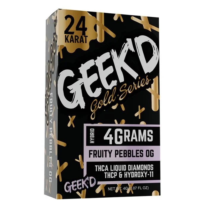 The GEEK'D 24K Gold Series Disposable 4G is designed for powerful, long-lasting effects. Infused with THCA Liquid Diamonds, THCP, and Hydroxy-11, this disposable provides a smooth vaping experience. Its user-friendly design features a preheat function and USB-C charging for convenience. With anti-clogging technology, it ensures a hassle-free experience. Sleek and portable, it's perfect for vaping enthusiasts on the move. FGEEK'D 24K Gold Series Disposable Flavors/Strain: Trainwreck - Sativa: Embark on a euphoric journey with Trainwreck, a sativa strain. Known for its invigorating effects, this strain offers a potent mix of creativity and energy. Expect a mind-altering experience that keeps you on track for an uplifting day. Strawberry Cough - Sativa: Indulge in the sweet and uplifting vibes of Strawberry Cough, a sativa strain. With its delicious strawberry flavor and cerebral effects, this strain is perfect for those seeking a burst of inspiration and motivation without the heaviness. Master Kush - Indica: Immerse yourself in relaxation with Master Kush, a classic indica strain. Renowned for its tranquilizing effects, this strain delivers a soothing body high and a sense of calm. Ideal for unwinding after a long day and promoting a restful night's sleep. Northern Lights - Indica: Experience the celestial tranquility of Northern Lights, an indica strain. This strain is celebrated for its deeply relaxing and sedating effects, making it a go-to choice for those seeking relief from stress, insomnia, or chronic pain. Dynasty OG - Hybrid: Unleash the best of both worlds with Dynasty OG, a hybrid strain. Blending sativa's uplifting qualities with indica's calming influence, this strain provides a balanced experience. Enjoy the harmonious fusion of euphoria and relaxation in every inhale. Fruity Pebbles OG - Hybrid: Delight your senses with Fruity Pebbles OG, a hybrid strain bursting with flavor. This well-balanced hybrid combines the sweetness of tropical frui