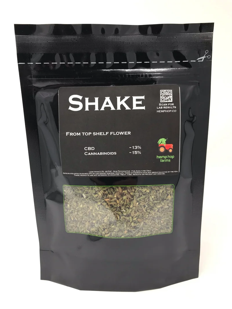 Shake from our top shelf CBD flower . Smaller buds that have been ground and homogenized for prerolleds/smoking or edibles. 1oz/28g Several strain options available. THCA Options are listed and labeled, if they are not labeled they are CBD dominant.