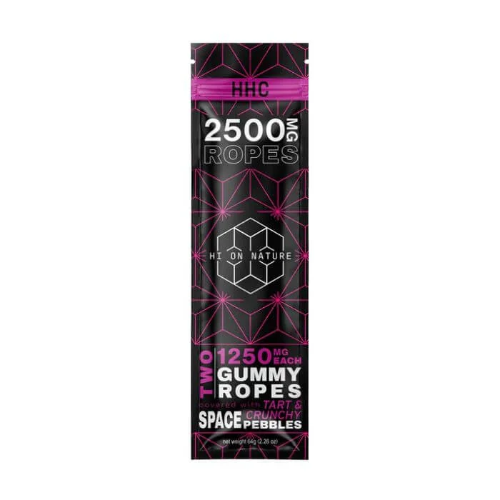 Giddy up space cowboy, our light speed lasso has picked up a LOT of tangy space pebbles. Just when you thought you tried it all, Hi on Nature is surprising you with a crunchy on the outside, soft on the inside bite you can’t resist. Combining HHC with all the best fruity flavors and a satisfying snap, you’ll be galloping around the galaxy in no time. Crafted from premium Farm Bill compliant West Coast hemp and diligently quality controlled to ensure each candy is properly dosed, we give you a hi-strength experience with every bite. Every rope is a rainbow mix of strawberry, grape, orange, lemon, and green apple 2500mg per package. 2 Ropes per package, 1250mg each.